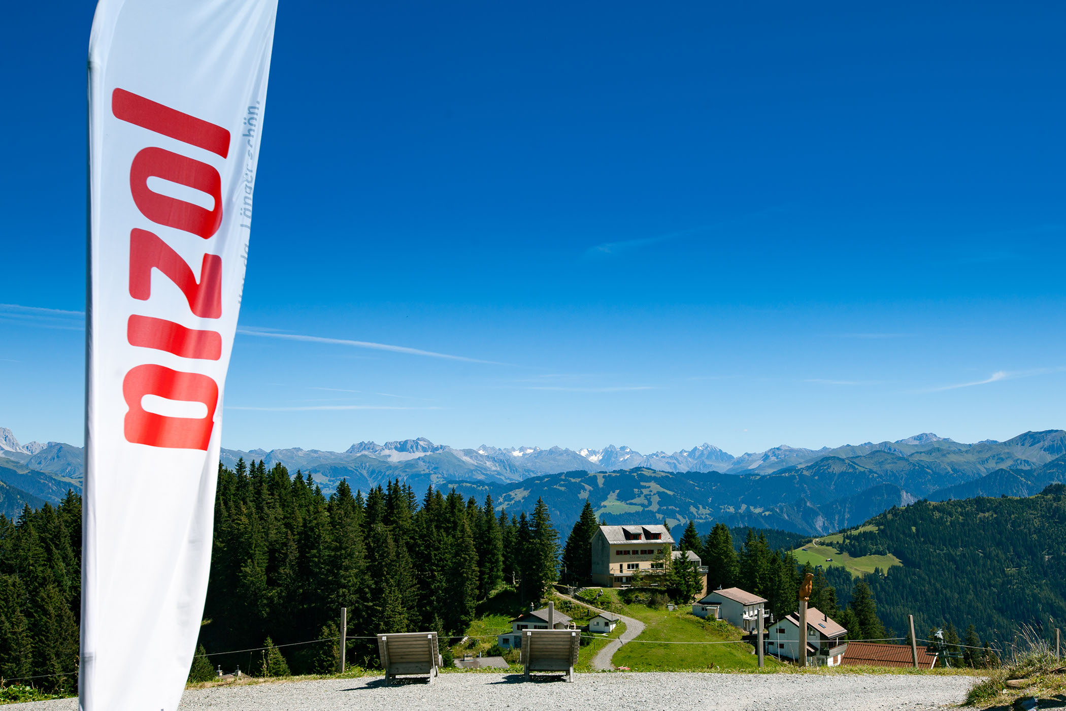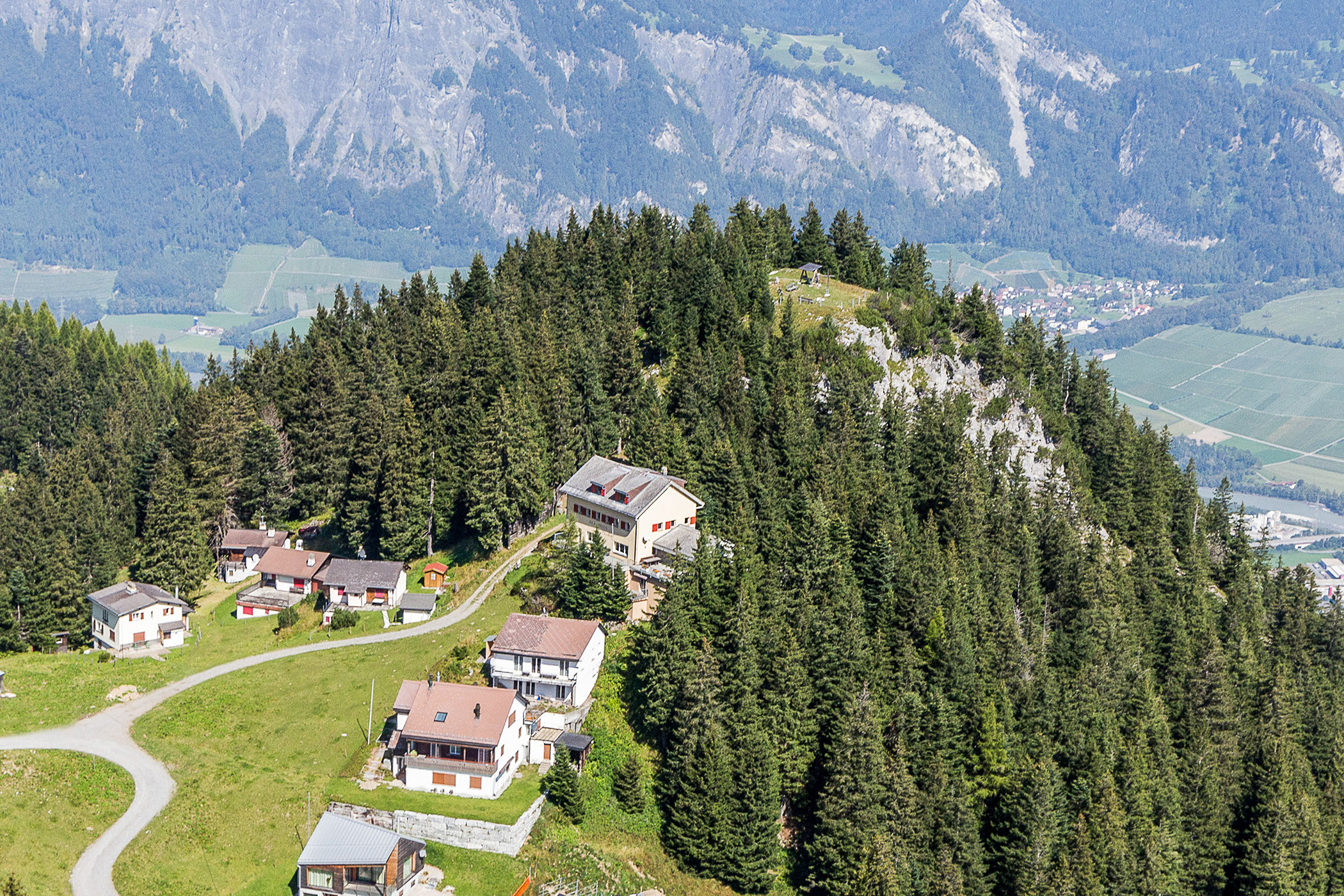 Die grosse Terrasse und die naturnahe Umgebung laden zum Verweilen ein und bieten eine fantastische Aussicht auf das Rheintal und die Bündner Berge.